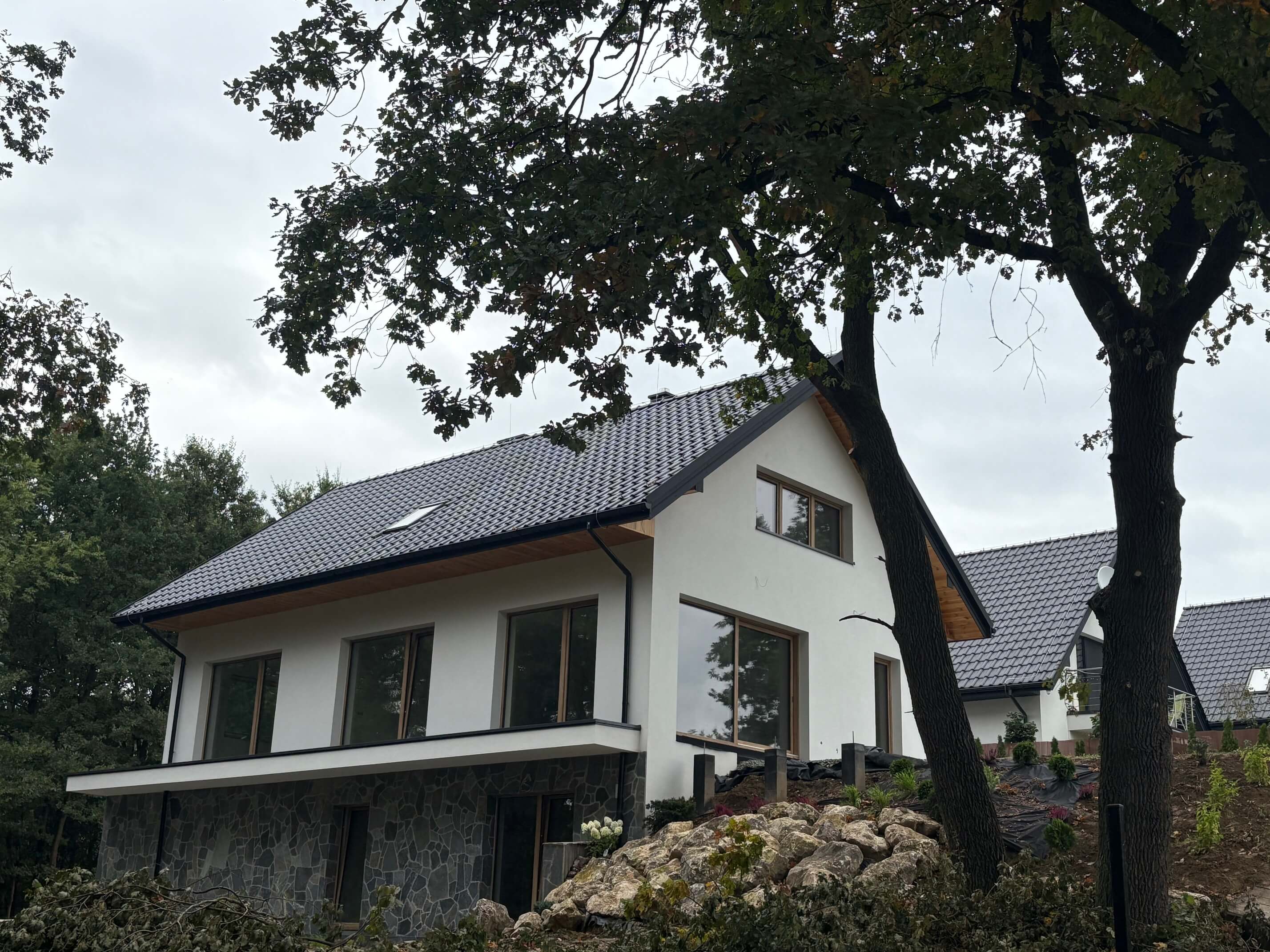 Dom, otoczony trzema wiekowymi dębami i zielenią, zapewnia prywatność i ciszę, a jednocześnie szybki dojazd do miasta. Wnętrze to imponujący salon z kominkiem, otwarta kuchnia z jadalnią, trzy wygodne sypialnie oraz dodatkowy pokój z dużą łazienką idealny na gabinet. Do dyspozycji mieszkańców jest również duża strefa rekreacyjna. Rok budowy 2025, ogrzewanie gazowe i kominkowe, klimatyzacja i instalacja alarmowa.